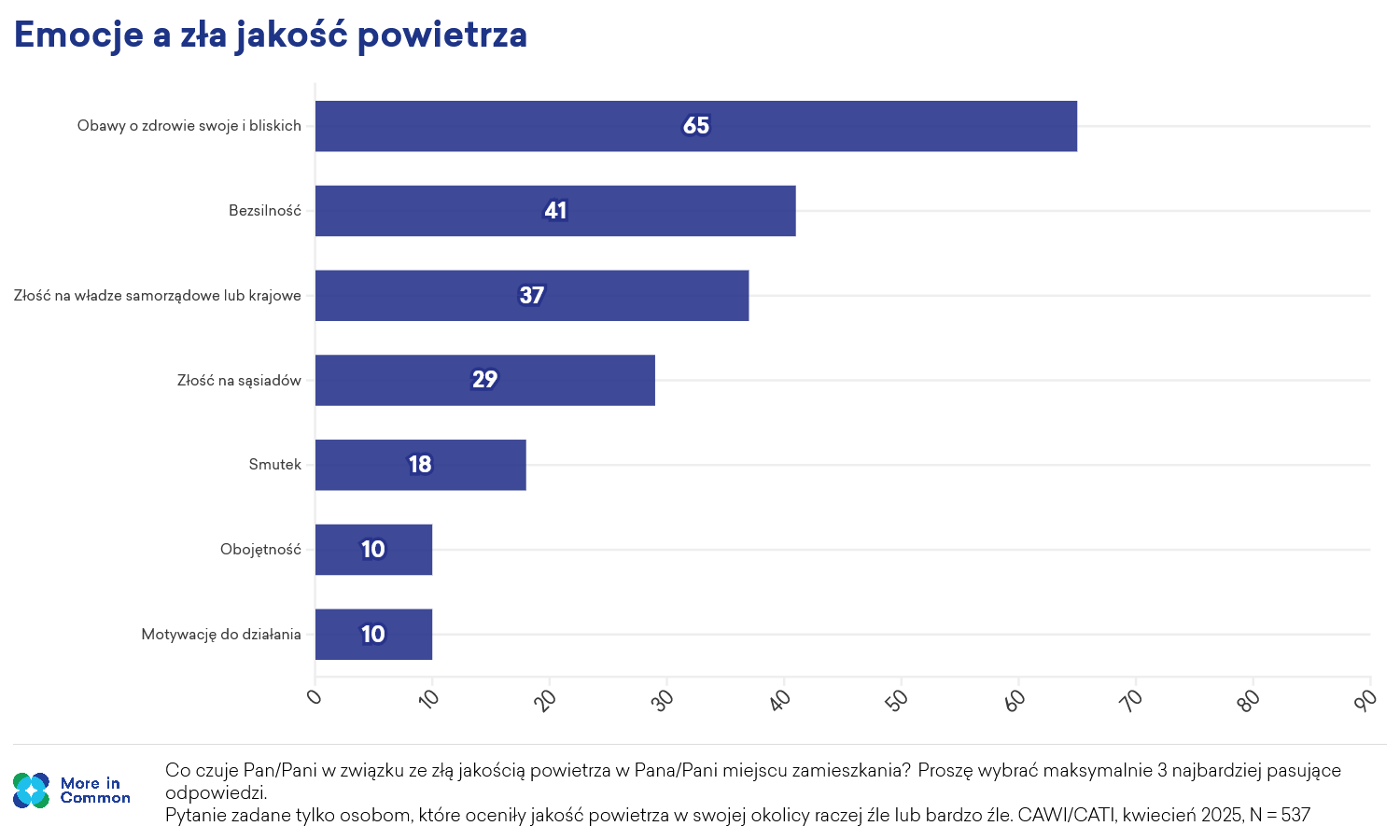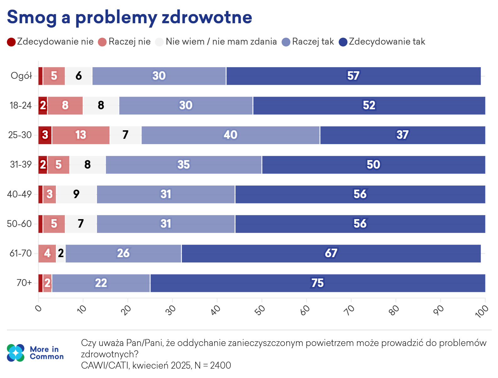 - Fundacja More in Common we współpracy z Polskim Alarmem Smogowym i agencją Profeina przeprowadziła wiosną największe jak dotąd badanie opinii i postaw Polek i Polaków wobec zagadnień związanych z zanieczyszczonym powietrzem. Oparty na nim raport “Pełną piersią? Polki i Polacy o smogu i jakości powietrza” pokazuje, że dla 87% z nas smog to realny problem zdrowotny.